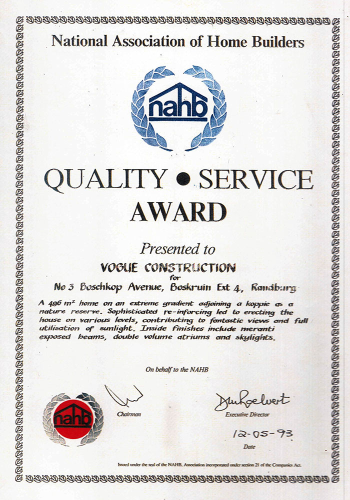 Vogue Construction is a Johannesburg based home building company that has specialised in the building of new homes since 1987. Vogue Construction has built over 100 homes to date. We have a long list of satisfied clients along with their positive feedback and referrals available. By using only specialised sub-contractors, overheads are kept low, and the quality of workmanship and service are of the highest standard.